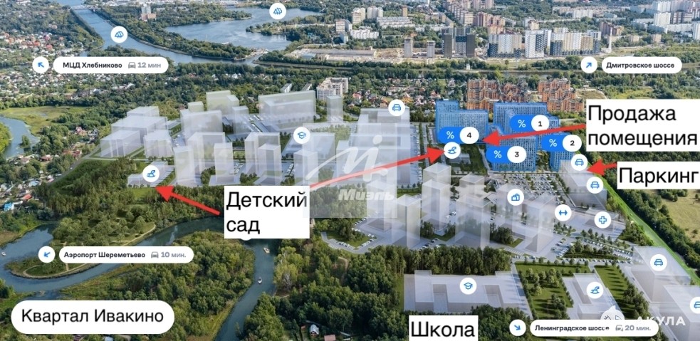 - Ленинградское шоссе, 10 км от МКАД, примыкает к существующей застройке с действующей инфраструктурой. Территория рядом также будет застроена высотными домами. МЦД Хлебниково 10 минут транспортом.