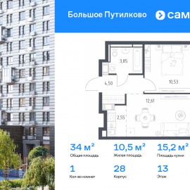 Строим кварталы для жизни с заботой о будущем. Предлагается 1-комнатная квартира комфорт-класса 34, 04 кв.м в корпусе 28 на 13 этаже, в ЖК «Большое Путилково» Квартира без отделки. Доступность опции «отделка» и возможность комплектации мебелью и декором уточняйте у...