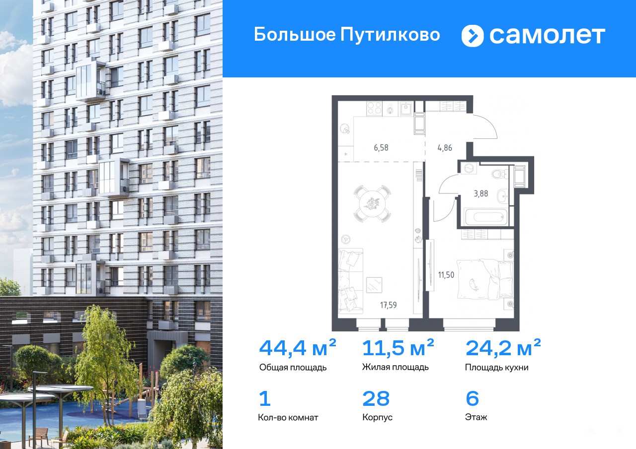 Строим кварталы для жизни с заботой о будущем. Предлагается 1-комнатная квартира комфорт-класса 44, 41 кв.м в корпусе 28 на 6 этаже, в ЖК «Большое Путилково»
