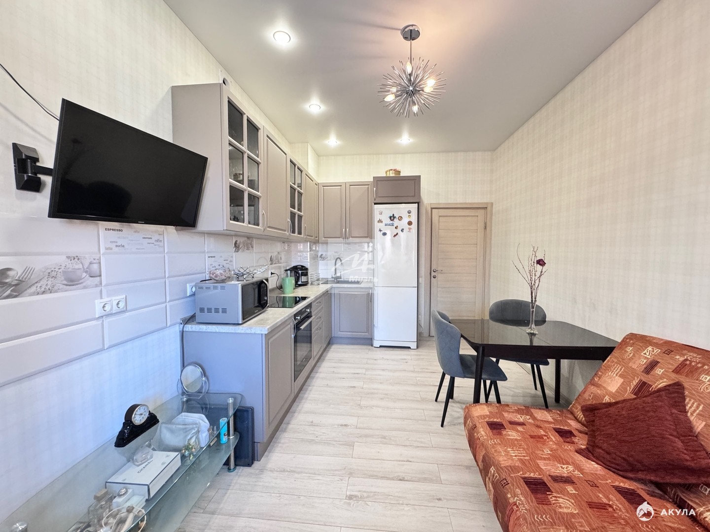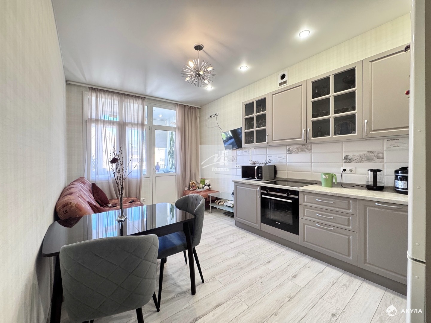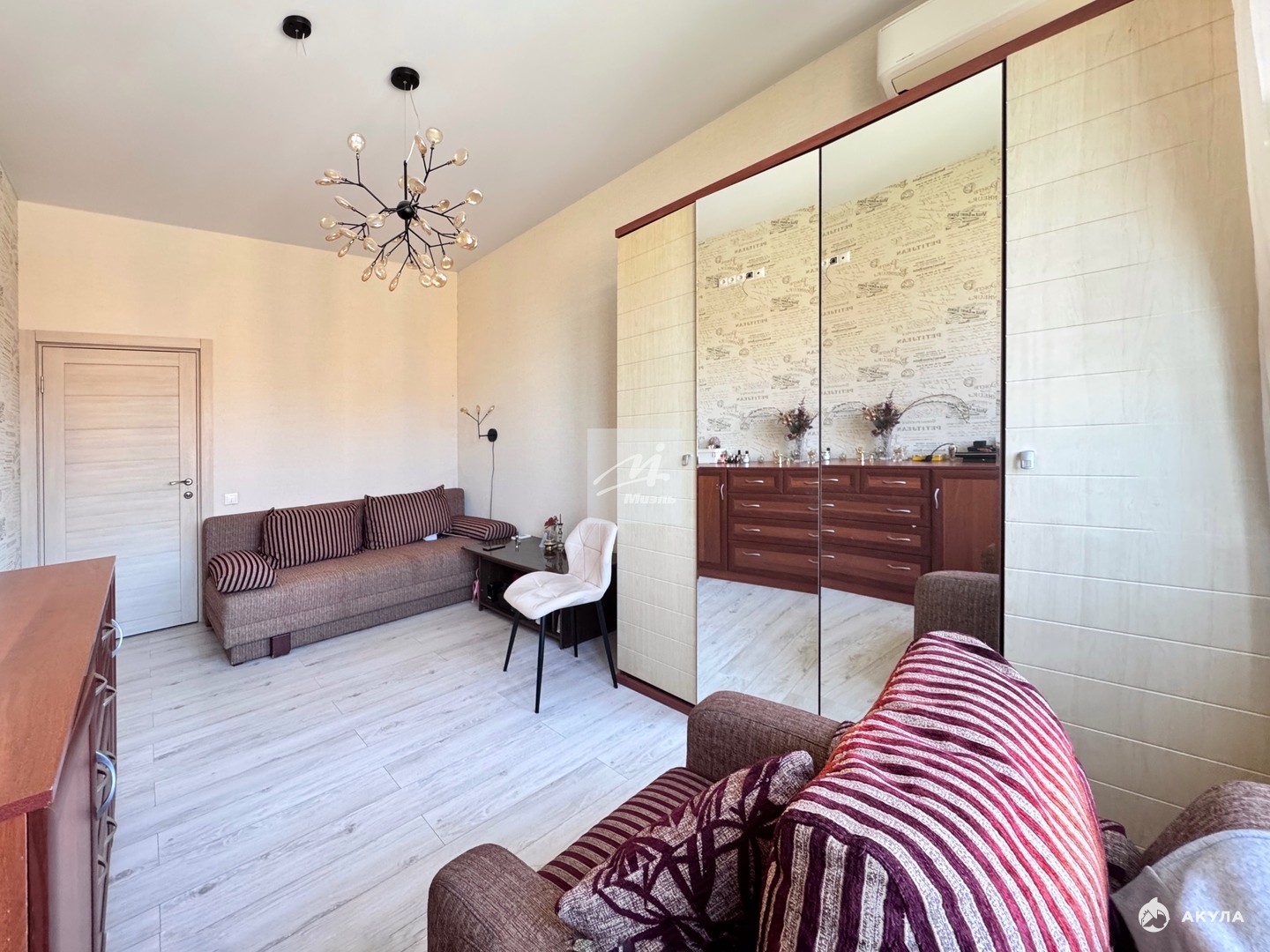- Просторная кухня-гостиная с выделенной зоной кабинета, большая спальная комнатой правильной формы, кладовая комната, раздельный санузел.