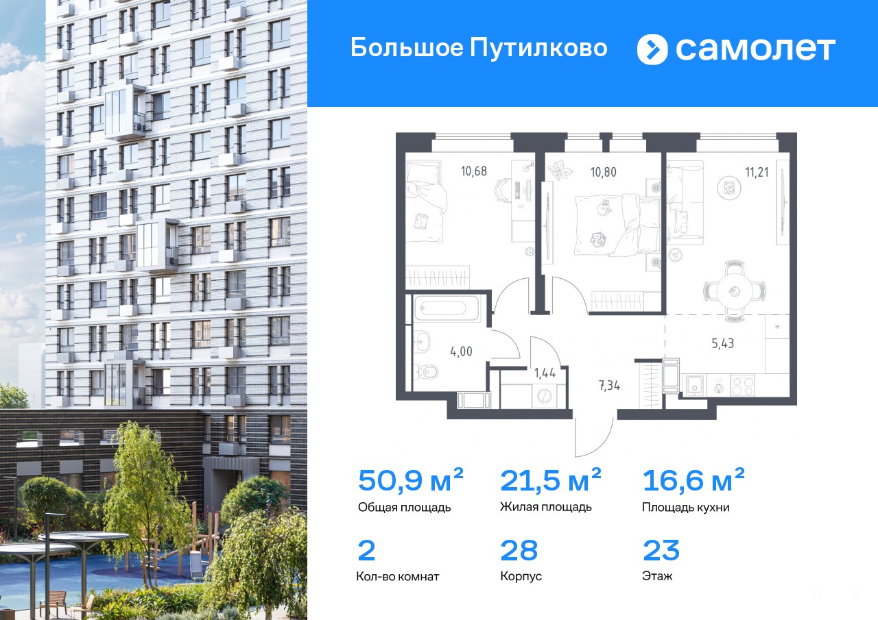 Строим кварталы для жизни с заботой о будущем. Предлагается 2-комнатная квартира комфорт-класса 50, 9 кв.м в корпусе 28 на 23 этаже, в ЖК «Большое Путилково»