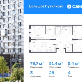 Строим кварталы для жизни с заботой о будущем. Предлагается 3-комнатная квартира комфорт-класса 79, 74 кв.м в корпусе 28 на 4 этаже, в ЖК «Большое Путилково» Квартира с чистовой отделкой. Доступность дополнительных опций уточняйте у застройщика. Приобрести квартиру возможно...