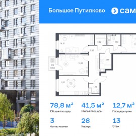 Строим кварталы для жизни с заботой о будущем. Предлагается 3-комнатная квартира комфорт-класса 78, 79 кв.м в корпусе 28 на 13 этаже, в ЖК «Большое Путилково» Квартира с чистовой отделкой. Доступность дополнительных опций уточняйте у застройщика. Приобрести квартиру возможно...