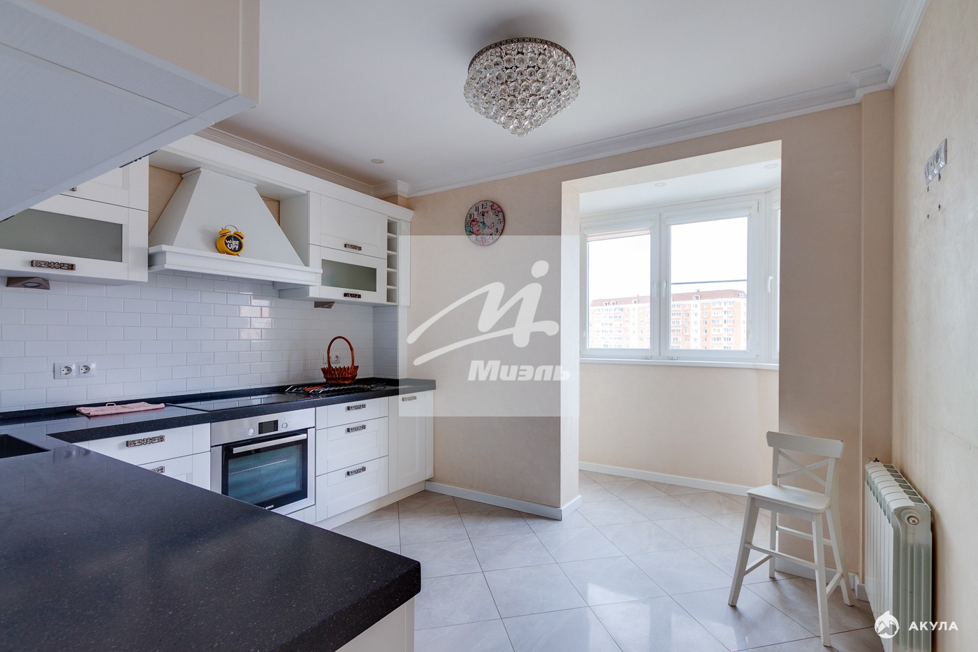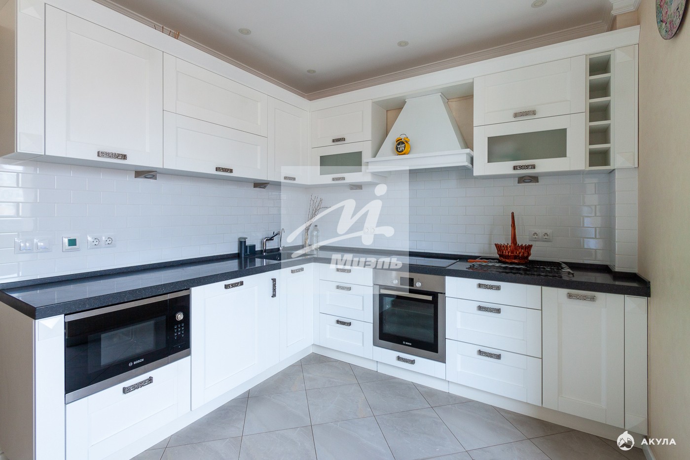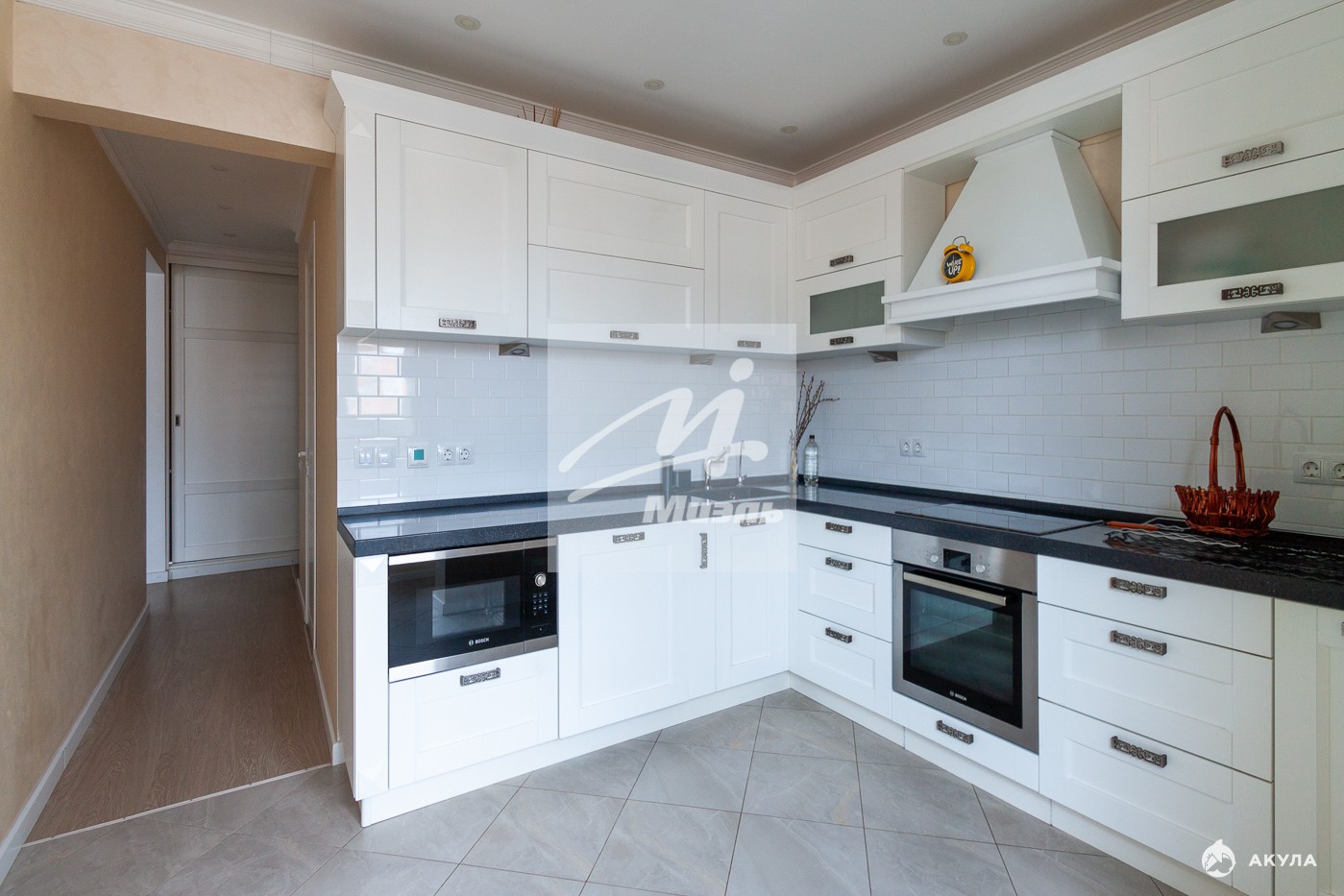 Установлена функциональная кухня с необходимой встроенной бытовой техникой и мебелью.