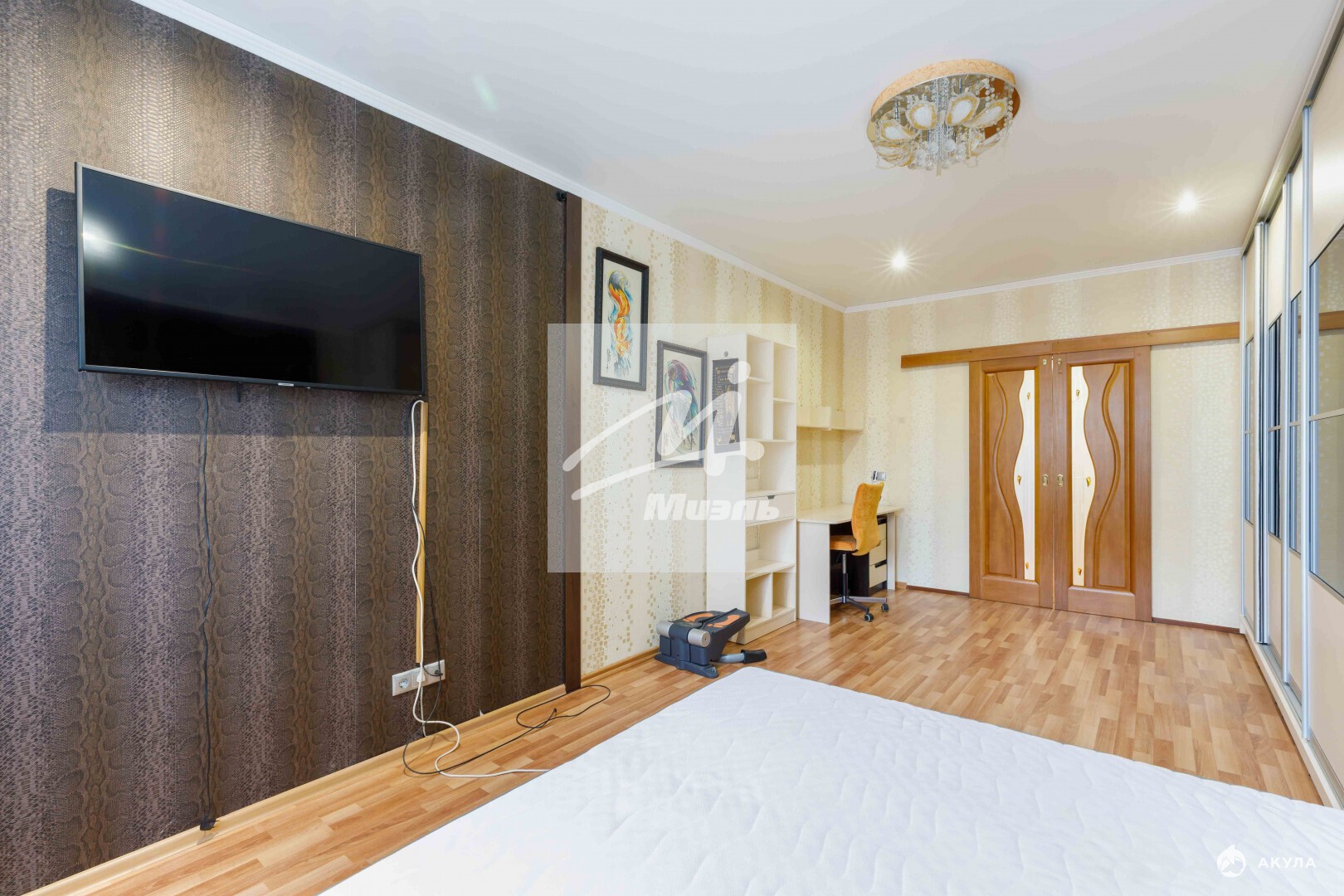 Квартира готова к проживанию. На кухне встроенный гарнитур с техникой, в спальне большая кровать. В каждой комнате и в прихожей вместительные шкафы-купе и встроенные книжные шкафы.