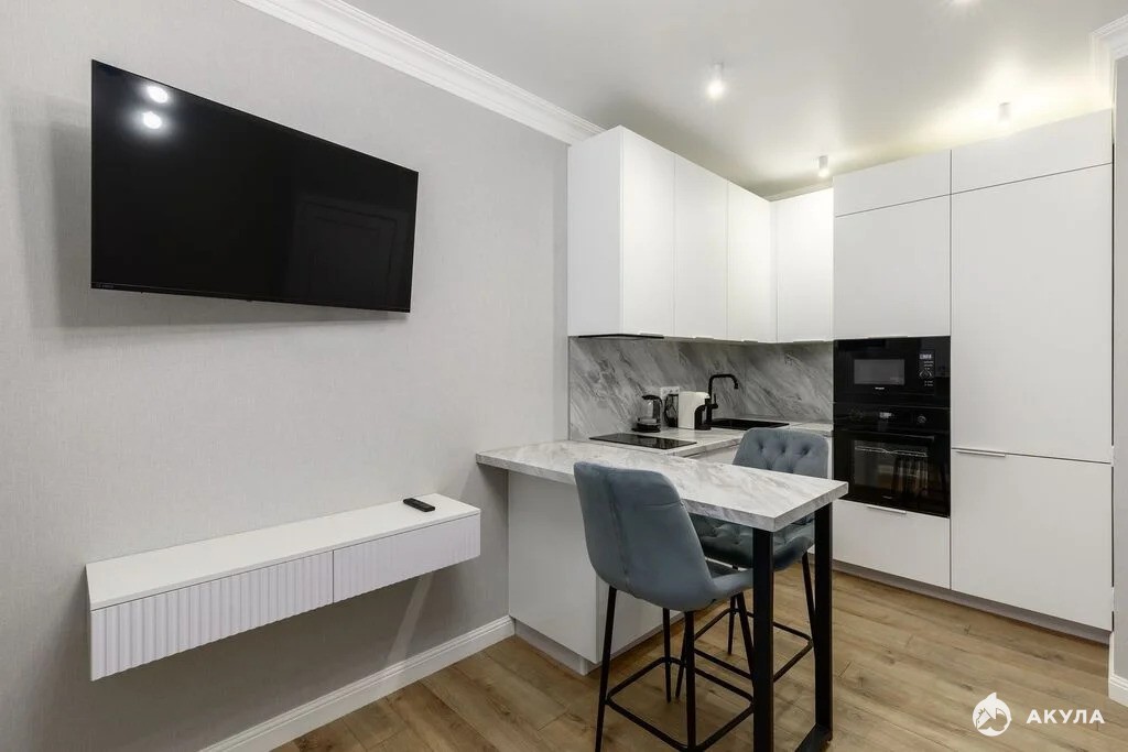 Жилой комплекс "Гелиос". Квартира оснащена мебелью и необходимой техникой. Встроенный кухонный гарнитур, бытовая техника (холодильник, микроволновая печь, чайник)