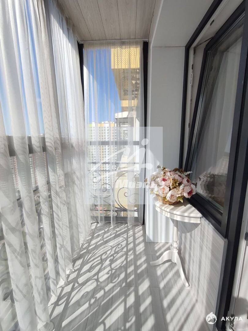 Главная комната (15 м²): двуспальная кровать 160×200, шкаф, 3 комода, тумбочки, панорамный балкон с видом на ухоженный двор.